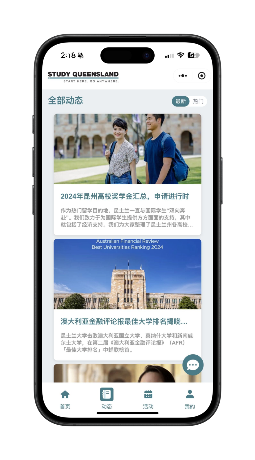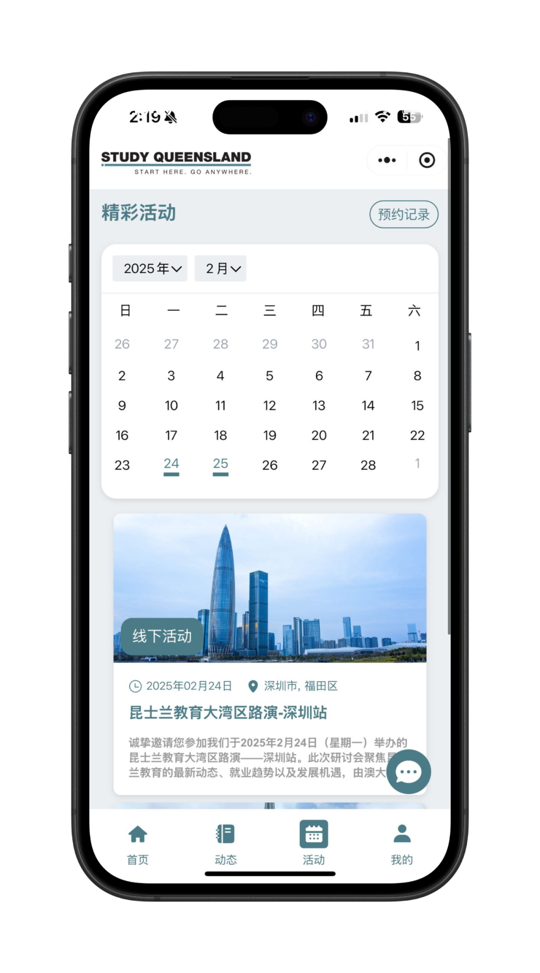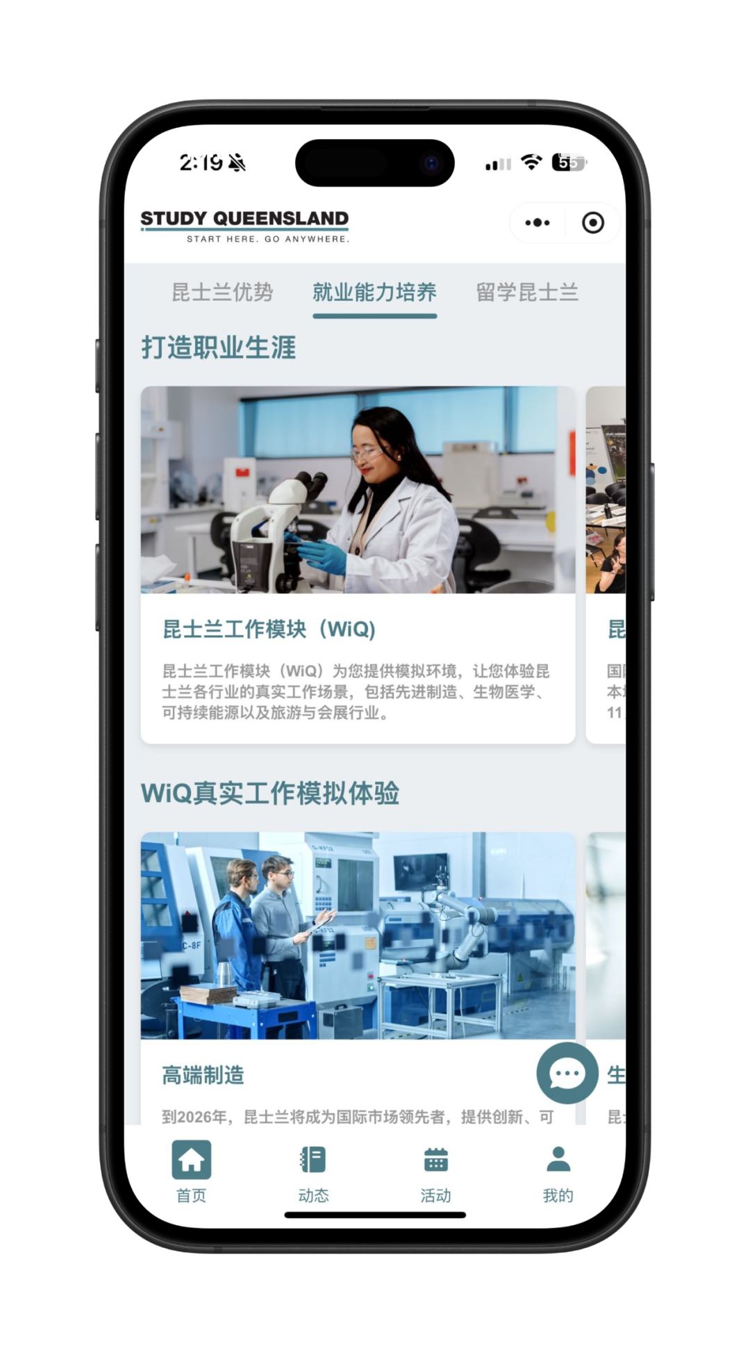 由昆士兰州政府国际教育署、地区教育推广局以及各大院校主办的各类线上线下交流分享活动。 通过无缝衔接的数字报名流程,助力构建中国留学生的精英人才社区。 未来还将上线更多互动功能与活动,更好联结学校与学生。