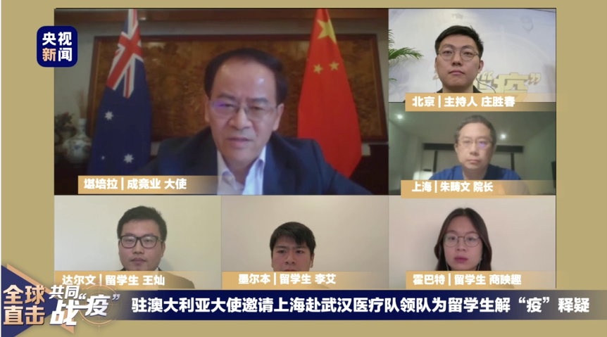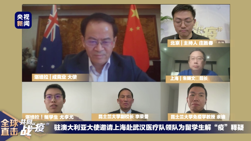 4月8日上午,中国驻澳大利亚大使成竞业邀请中澳医疗专家做客央视新闻《共同战“疫”》直播连线,为澳中国留学生解“疫”答惑。