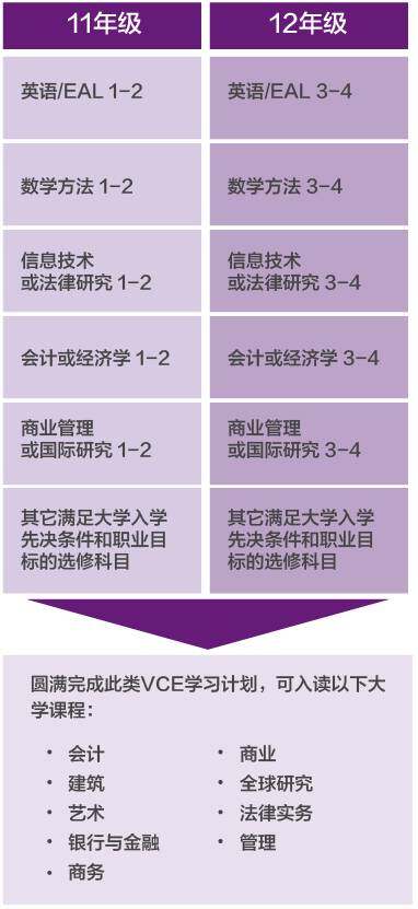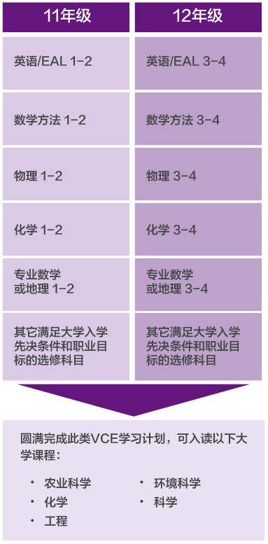 此外,要获得VCE证书,学生还必须圆满完成英语或英语作为第二语言(EAL)必修科目。国际学生可根据已规划的高等教育学习途径、学业优势和个人兴趣,选择其它所有科目。