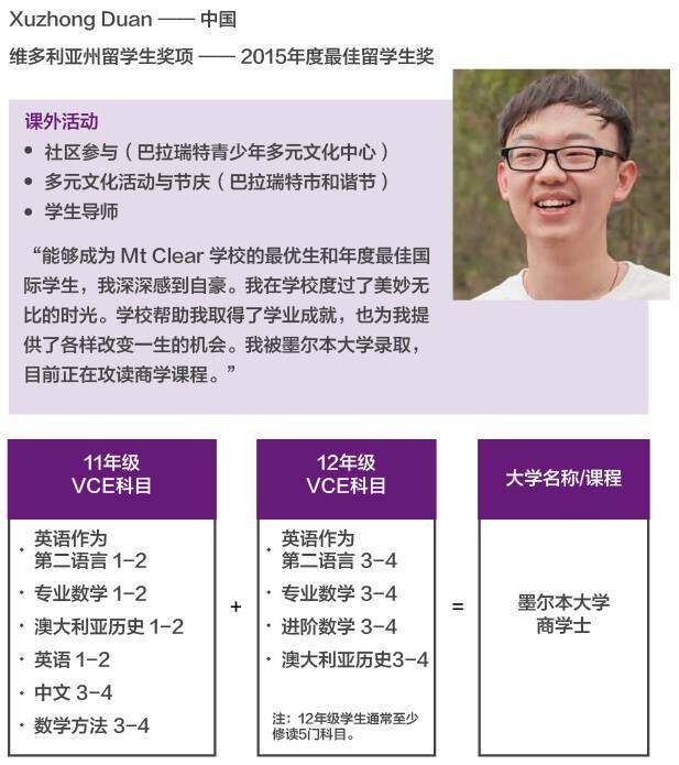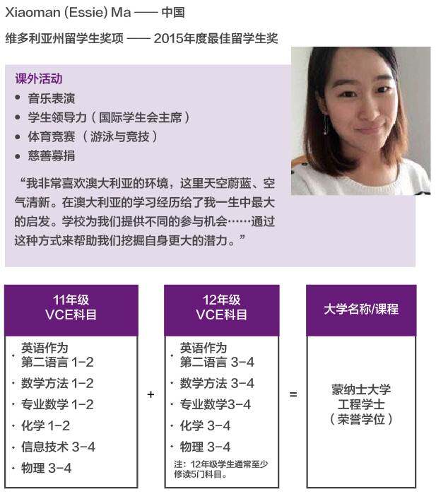 维多利亚公立中学每年约有2000名国际学生圆满完成VCE课程并毕业。下面我们就为大家介绍其中两名来自中国的毕业生在校时期的课程和课外活动安排。