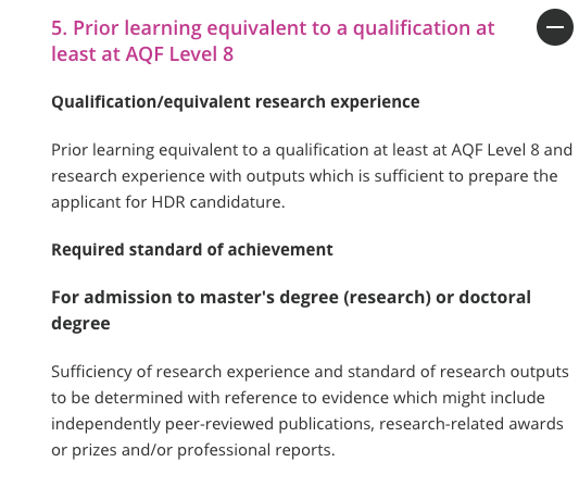 a) 完成澳大利亚学历资格框架(Australian Qualifications Framework,简称AQF)第8级或者第9级课程的全日制学习,研究型学习占总科目的25%,并取得同等于迪肯大学学术成绩70%。