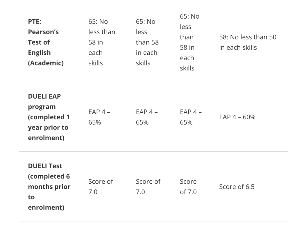 迪肯大学接受多种英语水平测试成绩,例如:雅思、托福、PTE、迪肯大学自属语言中心(DUELI)内部语言测试。
